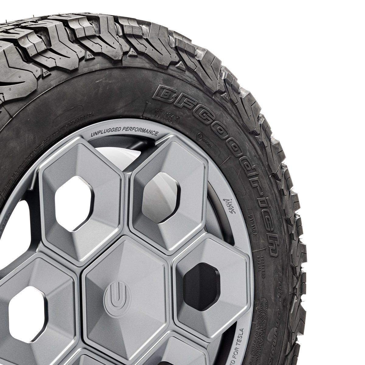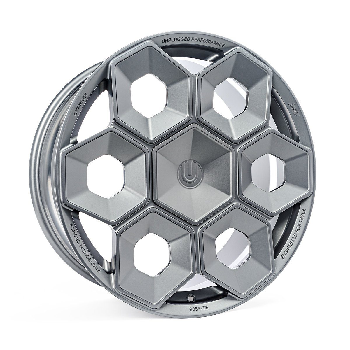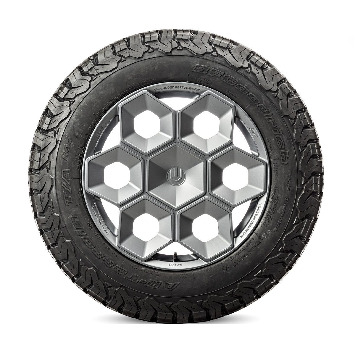Construction: Produced in aerospace-grade 6061-T6 forged aluminum for maximum weight savings and durability, the Unplugged Performance CYBRHEX wheels are built from the ground up to perform, literally. The final result was the first wheel designed and engineered specifically for the Tesla Cybertruck with toughness and design-DNA appropriate for an adventure-filled CYBR future.
