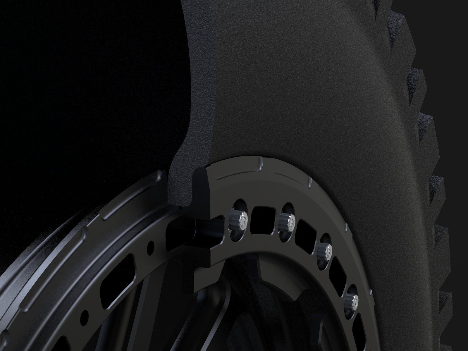 Beadlock Mounted – Here you can see how the tire’s bead is mounting outside the wheel’s rim and is secured in place by the beadlock ring.