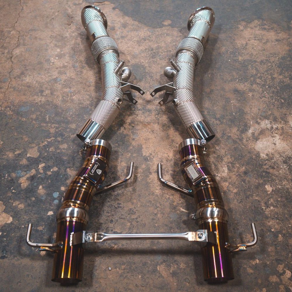 Valvetronic Designs’ non-valved titanium exhaust for the SF90 uses larger, unrestricted piping to sharpen response, boost turbo spool, and deliver an unfiltered, high-frequency, race-bred soundtrack