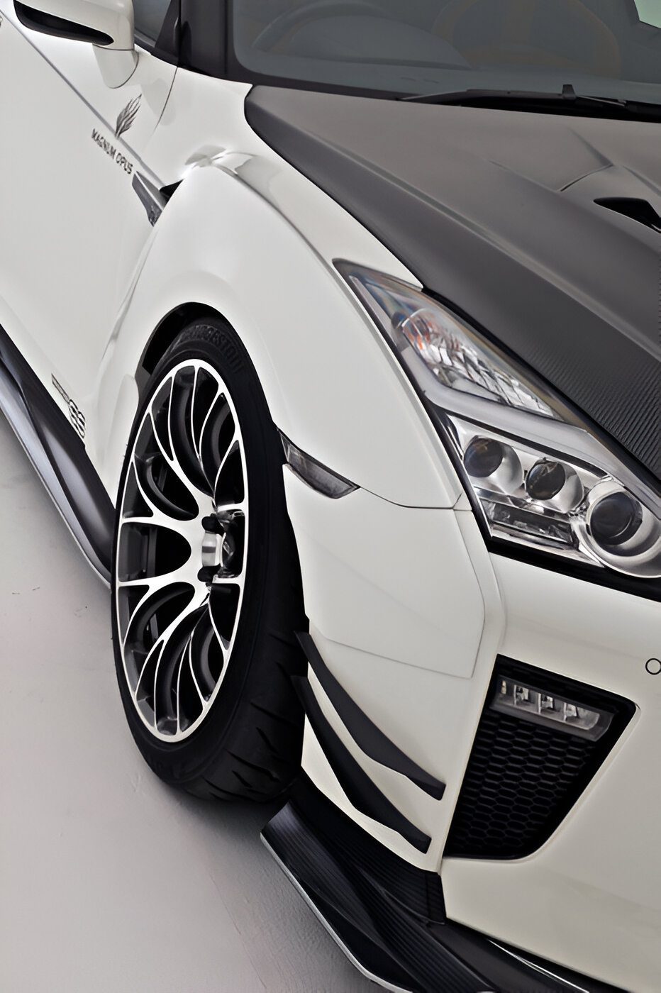 Introducing the Varis Magnum Opus ’18 Ver. Front Wide Fender Set with Extension Covers for the EBA-R35 Nissan GT-R, a high-end aero series for street enthusiasts, debuted at the 2018 Tokyo Auto Salon. This second evolution of the Magnum Opus for the R35 GT-R is compatible with MY17 models and offers a choice between FRP with twill weave carbon fiber accents or all-FRP versions. The set includes front bumper extension panels designed to fit seamlessly with the OEM Nissan front bumper cover. Adding +20mm per side, these fenders allow for larger wheel and tire setups, enhancing both performance and aesthetics. Transform your GT-R with the sophisticated and functional design of Varis Magnum Opus.