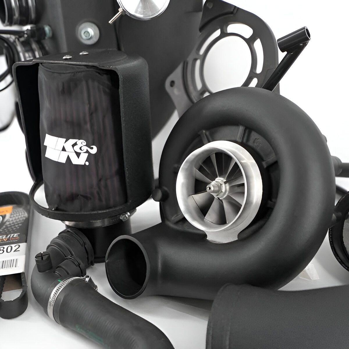 • This setup maintains alignment with the original serpentine belt, utilizing an OEM belt configuration, and retains full functionality of the OEM active-spring belt tensioner to prevent slippage without requiring manual adjustments. The system features an advanced water-cooled design, ensuring consistent performance by effectively regulating operating temperatures, making it ideal for both spirited drives and demanding track use. Custom-molded polypropylene plastic air ducts are seamlessly integrated for a factory-like appearance and precise fit, while the inclusion of a Bosch boost overrun system ensures smooth off-throttle transitions.