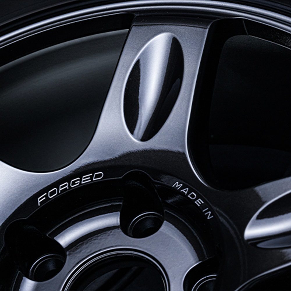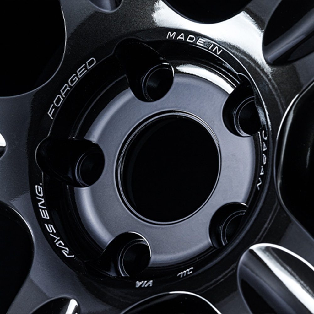 • ‘RAYS ENG. / FORGED / MADE IN JAPAN’ lettering is engraved on the center section using RAYS’ patented A.M.T. (advanced machining technology), underscoring the precision of the finish.