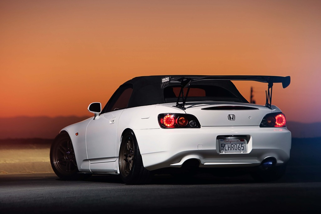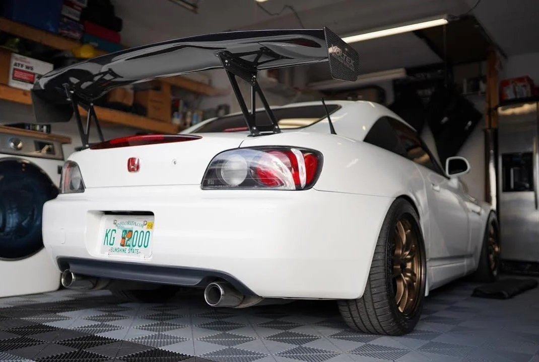 The Voltex Type-2 GT Wing for the Honda S2000 enhances aerodynamics with its lightweight wet carbon fiber build, 1600mm wing span, and 245mm stand height, delivering optimal downforce and race-inspired style.