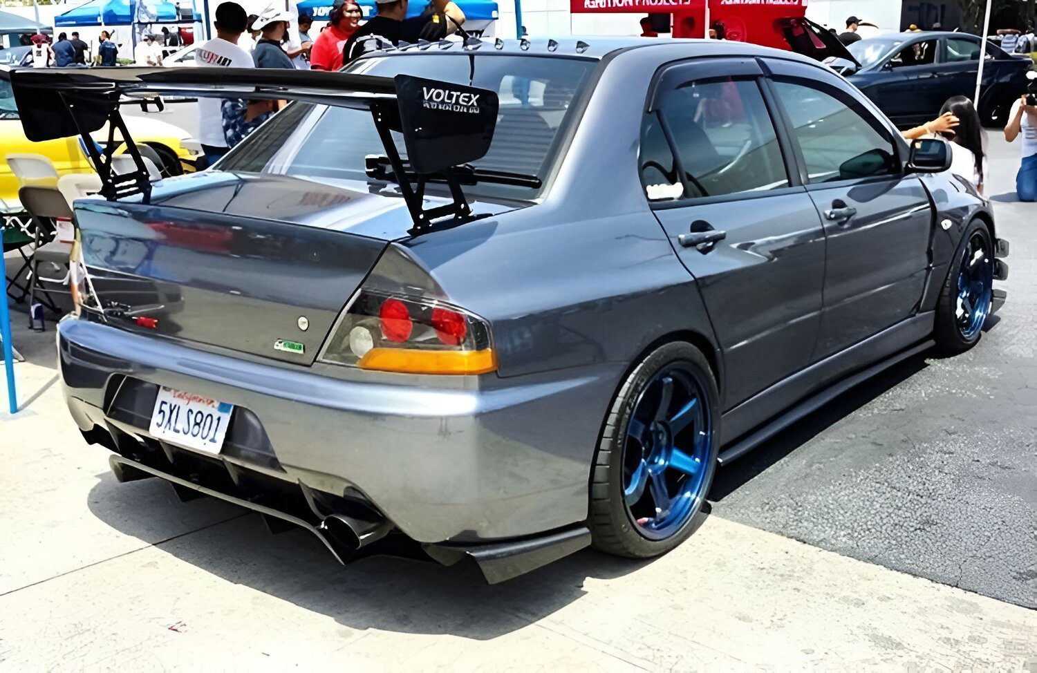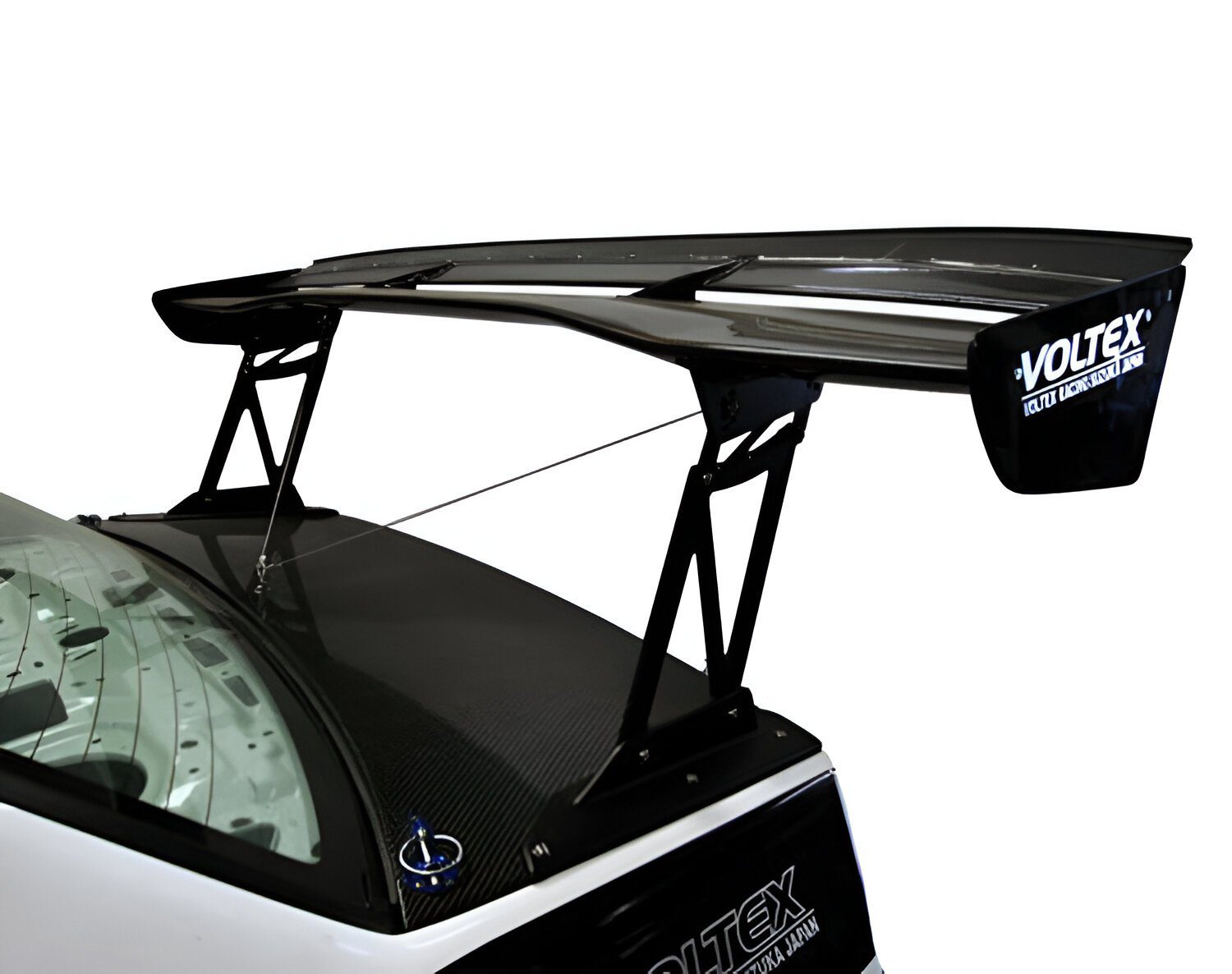 The Voltex Type-5 GT Wing for the Mitsubishi Evo 7, 8, and 9 enhances aerodynamics and stability with its lightweight wet carbon fiber build, delivering a bold, race-inspired look and superior downforce.