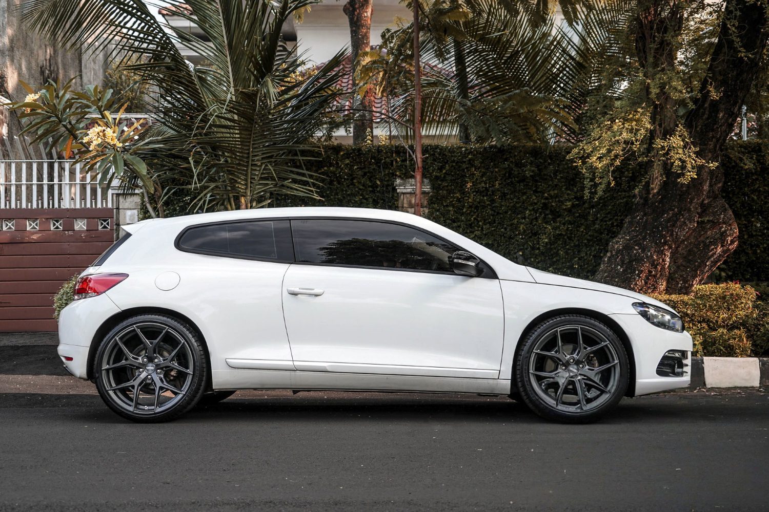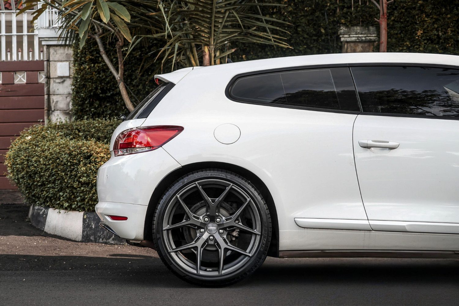 Matte Gunmetal HF-5: Hybrid Forged Y-spoke with a flow-formed barrel — lightweight, rigid, motorsport-inspired.