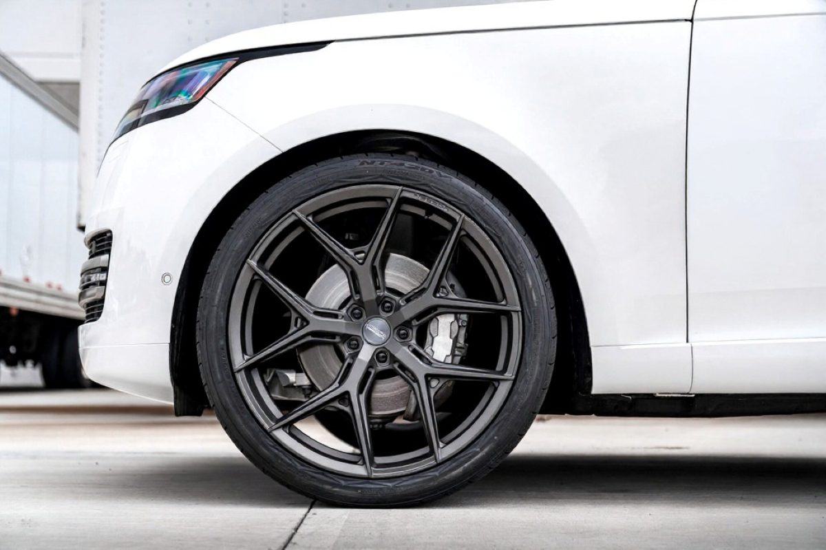 Matte Gunmetal HF-5: Hybrid Forged Y-spoke with a flow-formed barrel — lightweight, rigid, motorsport-inspired — available in multiple 5-lug sizes and concavities for precise fitment.