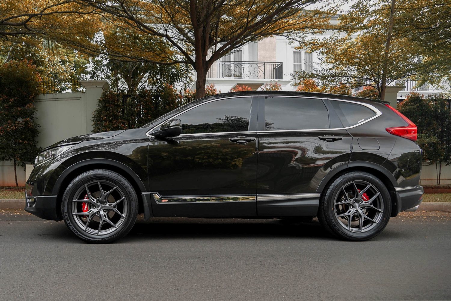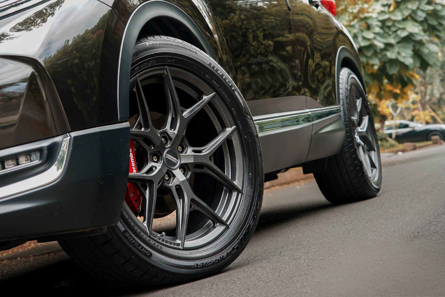 Hybrid Forged Vossen HF-5 in Matte Gunmetal: modern Y-spoke wheel with a flow-formed barrel for lightweight rigidity, a premium muted finish, and multiple sizes / concavities for precise 5-lug fitment.