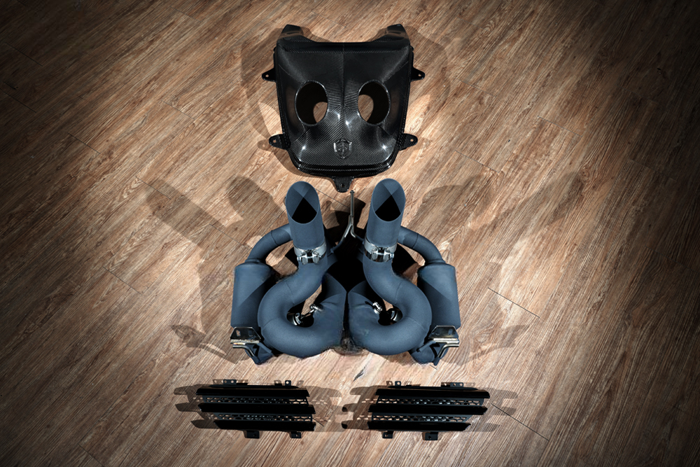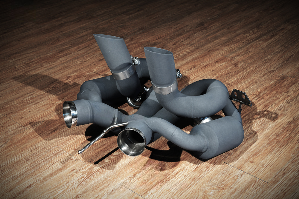 The McLaren 650S Volcano Conversion Kit by Fi Exhaust enhances performance with a valvetronic system crafted from T304 stainless steel, boosting torque and horsepower by 5-10% in a race setup. Delivering a refined or bold exhaust note depending on valve settings for an exceptional driving experience.